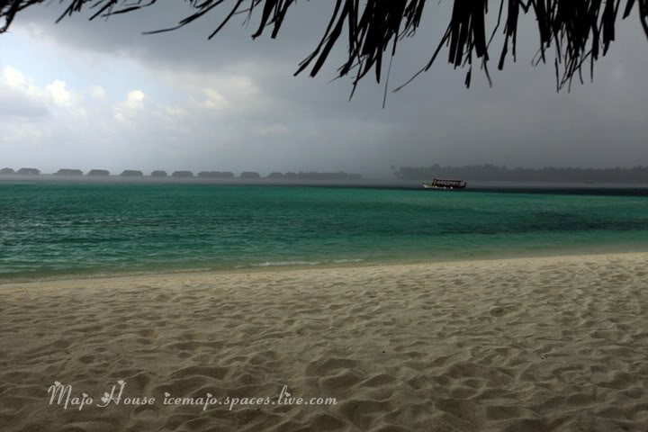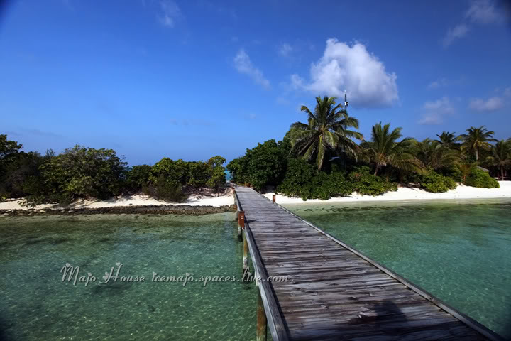 这个是水上屋连接陆地的木堤,树丛的那边,就是另外一面的大海。这个岛的宽度,是非常窄的。