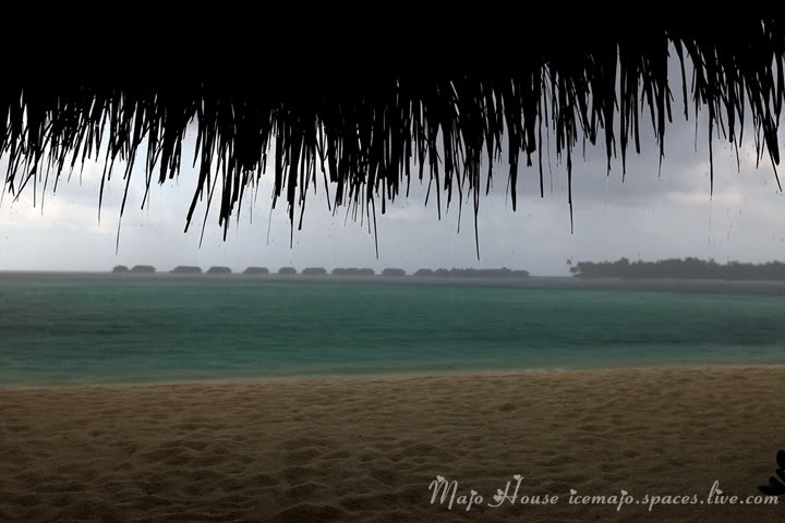 我们避雨的草帽伞,其实很大的,下面可以容纳4张沙滩椅。可是这个雨不但大,而且还是斜着潲进来。