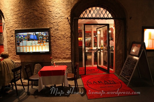 此时在夜晚的小巷游走,主要是要找一家餐厅吃晚餐的。事前没有做任何的功课,就想着说碰到什么顺眼就去什么店就好。 正巧,就看到了这家 Saran Essbar,主要是门口的 Rick Steves 的照片太显眼。