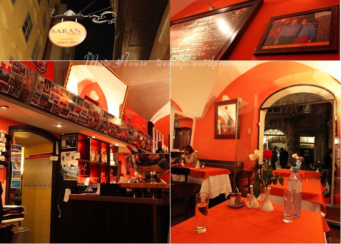 Saran Essbar http://www.saranessbar.at/Saran_Essbar.html 是一家印度人开的餐厅,主要供应的是印度,意大利,还有奥地利风格的菜肴。整个餐厅不是很大,却是精心设计过的。内部都被漆成了橘红色,这点比较印度风,不过四周的画还有小摆设是比较走国际路线的。在前面小小吧台的那面墙上,贴满了世界各地的明信片,都是曾经来进餐的顾客后来寄过来的。我仔细观察了一下,真的是世界各地,七大洲都包括哦。老板好幸福~ 看,墙上还有他和 Rick 的合影呢。