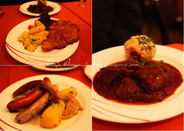 在这边我们主要点了奥地利的菜,因为不想要在这边吃别国家的。选择并不是很多,主要都是很类似德国系的大肉。这下面有猪排,炖牛肉,还有奥地利香肠。香肠我觉得还满美味的,三种不同的都很入味,空口吃也不会觉得咸。 炖牛肉还比较嫩,但是酱汁有些发甜这个我不是很喜欢;猪排呢,就比较普通了。
