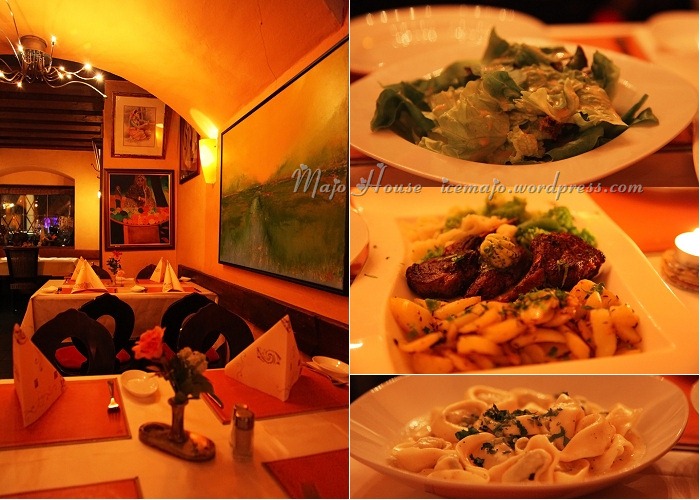 Okay, 回到中秋夜。话说白天走了转了一整天的,到了晚上的时候应该是太累了吧,所以我看完月色以后就眼皮发沉开始恍惚。依旧没有怎么寻找,就近在那条主街附近找了这家 Zum Mohren http://www.restaurant-zummohren.at/en/ 。 这依旧是一家包括了 印度,意大利,还有奥地利菜肴的餐厅,相传最早是在16世纪就已经存在于萨尔茨堡了。历史上很多有名的人都在此用餐,其中包括莫扎特还有舒伯特。