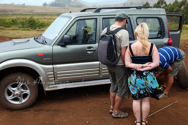 上岛第二天,参加了西海岸环游,不但碰上阴雨天,还半路荒山爆胎。哈哈哈~~ 四周完全没有人哦,Mark同学花费了很长时间才换好了轮胎。