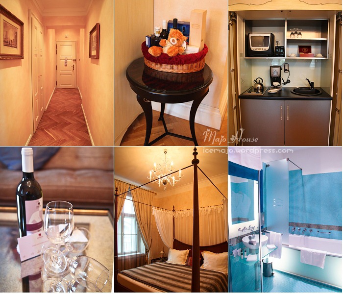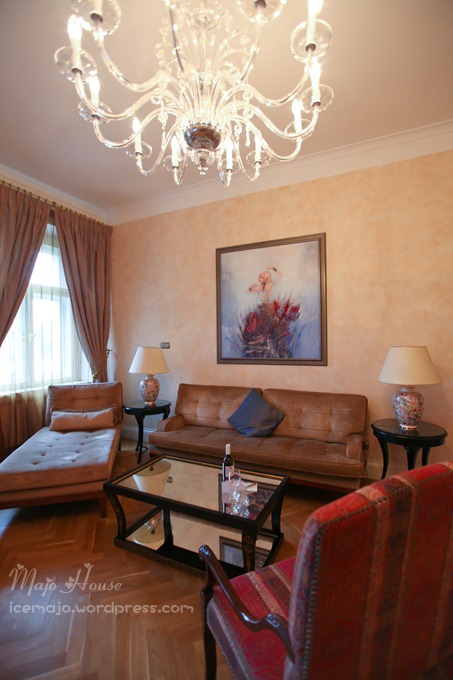 在这里我定的房型是 Deluxe Suite,有长长的玄关走廊,大大的客厅,简易的厨房,单独的卧室,还有两个厕所不过浴室只有一个。整套是75m2/ 807ft2 的面积,然后客厅那里有一排很大很大的窗户,窗外可以看到查理大桥还有布拉格城堡。 刚刚进到房间里面我有一点点刘姥姥初入大观园的感觉,因为好大哦,感觉好华丽哦,对比之前我那简陋的宿舍屋。