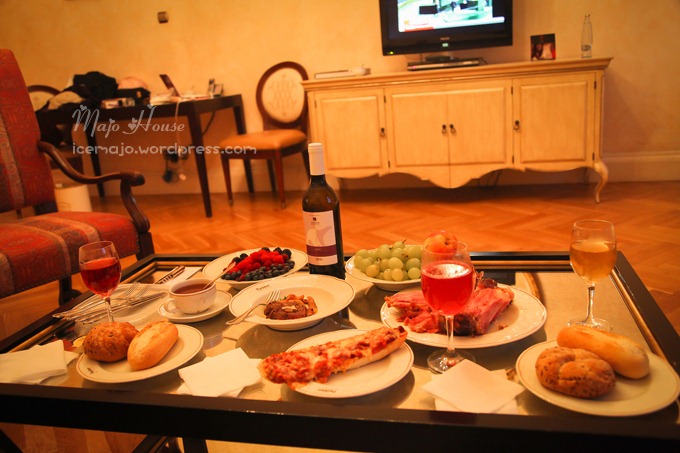 大概就是这里面太舒服,有一晚我们并没有出去吃饭。先在外面小超市买了些水果和面包,热了热前一晚从好兵帅克 U Kalicha 那里外带回来的大肉,舒舒服服一边看电视一边吃光光。房间内的简易厨房,别看它不大,盘子杯子刀子叉子可齐全啦。然后吃完摆在那边水池子里,他们housekeeping还帮忙给洗了,哇哈哈哈~ 贵族的日子啊。