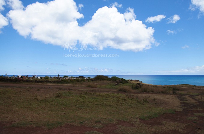 民宿门口左边的路边有一片墓地,然后右边就是岛上有名的阿胡 Ahu Tahai 塔海。阿胡 Ahu 是这种大头的平台的统称,阿胡上面的大头是 Moai 摩艾石像。