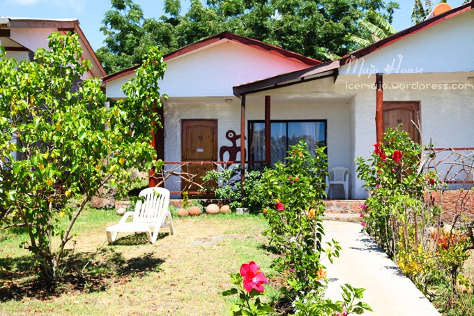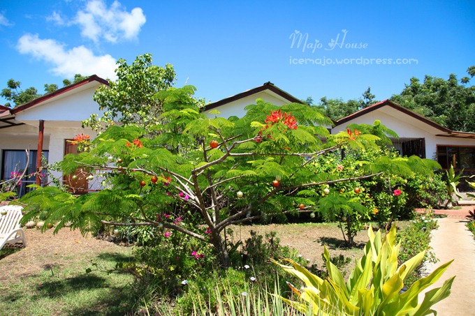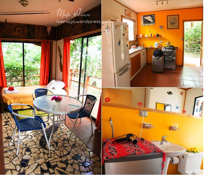 上面还有一个公用的厨房和餐厅,是给客人们用的,虽然说在靠近主人住的那排主屋里面有设早餐厅和小客厅,不过这里这个应该就是给客人说万一他们想自己煮饭呢。这个院子里面还凌乱的,随便的,种了很多果树;菠萝啊,香蕉啊,木瓜,芒果啊,客人们可以自己看着爽就自己摘来自食。哈~ 够随性吧。