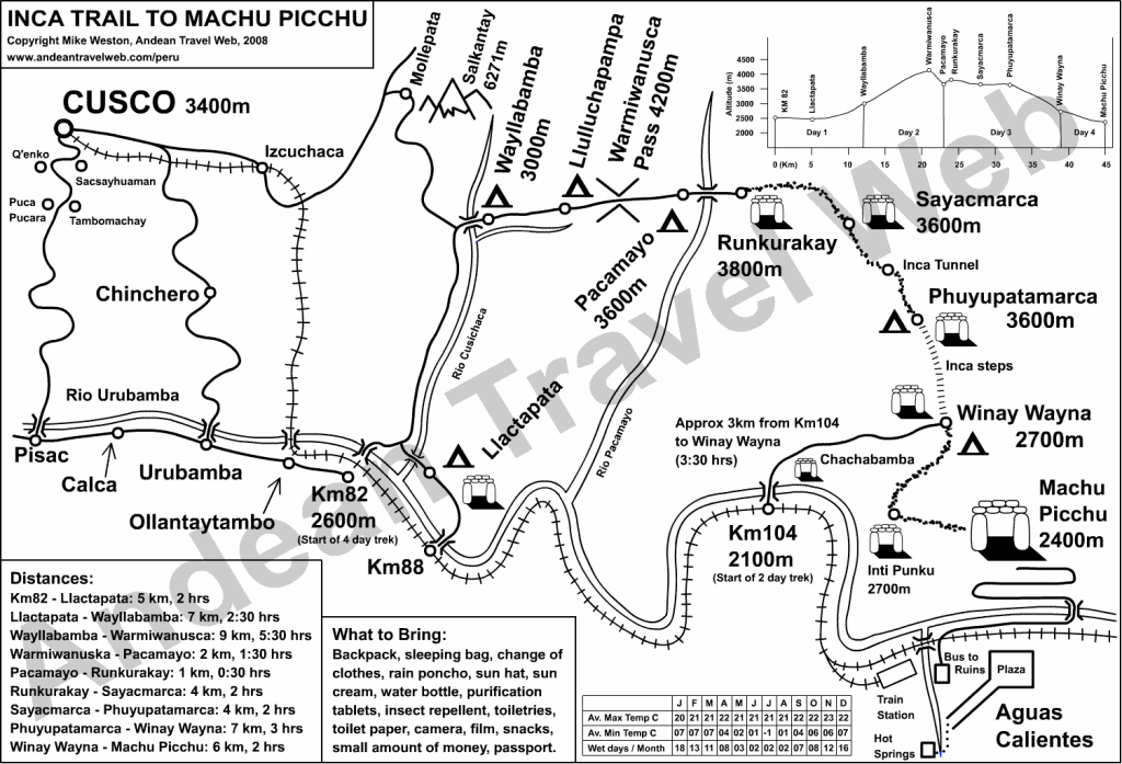 至于接下来4天的路程, 第一天最好走,多数是平路,路程也较短,海拔也比较低平均 2500米; 第二天是公认最难的一天,虽然路程最短但是一大半都是上坡路并且是高原,最高处有4300米; 第三天的风景最美,上坡只有一小点,只不过这天的路程最长; 最后一天需要更早凌晨三点就起,然后就是走两个小时到马丘比丘就大功告成了。 基本上,我们觉得,如果可以熬过第二天, 应该就算是成功了一大半吧。