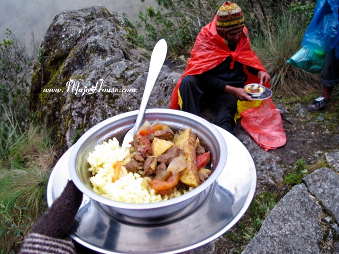 到后来,走着走着前方出现两位背夫。起初以为他们只是过路人,后来看到他们停顿在我们面前,和Guido用西班牙文交谈起来。后来就见他们坐在路边悬崖上的大石头上,开始打开随身带着的两个塑料袋。这时候Guido才解释给我说,这些人是过来给我们送饭的。营地那里已经开午饭了,只是我们还没有回去,所以他们就过来给我们送饭来。让我们赶紧趁热吃掉,然后身体有了能量,就可以一鼓作气的走去营地了。