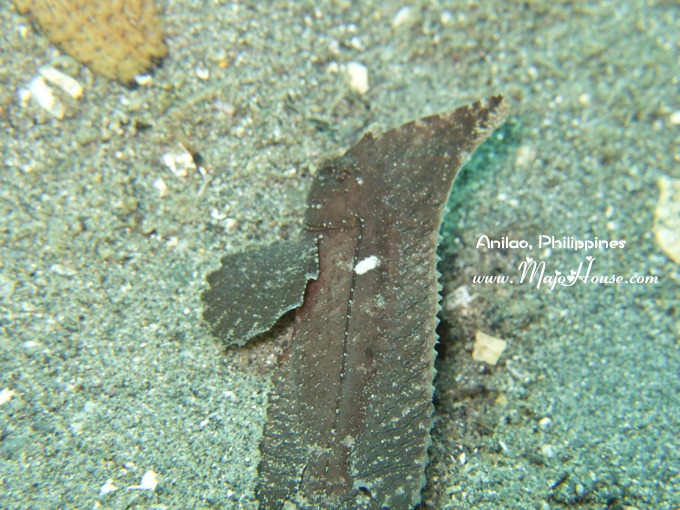 昨天晚上潜导和我说,今天可以看到火焰乌贼还有frogfish娃娃鱼; 不过今天刚下水看到的好像是水蛇还是Blenny Fish布莱尼一样长长的鱼躲在铁罐子里面。接下来是两片顺着水流东倒西歪的长得很难看的鱼,一条咖啡一条是土黄色的,也不知道是什么东西。不过后来回家后我上网搜过,原来这是Waspfish,俗称济公鱼。