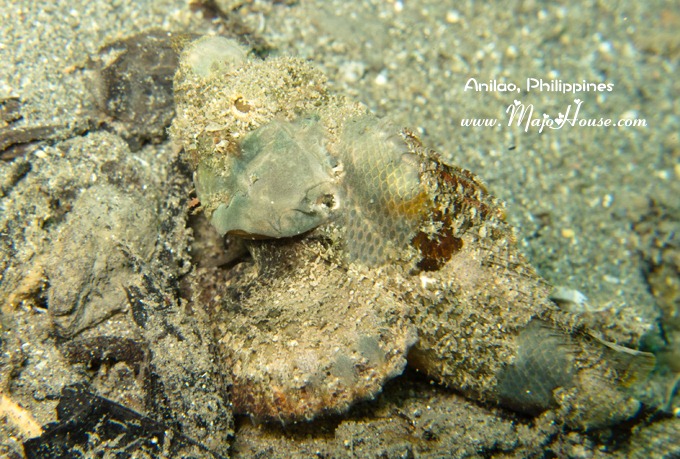 昨天晚上潜导和我说,今天可以看到火焰乌贼还有frogfish娃娃鱼; 不过今天刚下水看到的好像是水蛇还是Blenny Fish布莱尼一样长长的鱼躲在铁罐子里面。接下来是两片顺着水流东倒西歪的长得很难看的鱼,一条咖啡一条是土黄色的,也不知道是什么东西。不过后来回家后我上网搜过,原来这是Waspfish,俗称济公鱼。