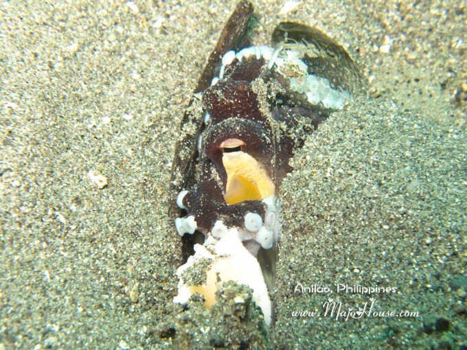 躲在破瓶子里面的小章鱼. 潜导一直拿着丁丁棒去挑逗它让它伸出头来,不过人家一般就是出来看一眼之后,就继续躲回去瓶子里面了,而且在怎么挑逗也不会上当冒头了。