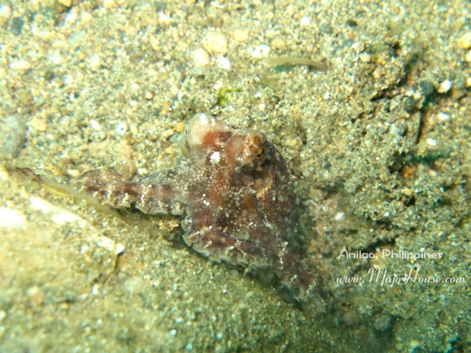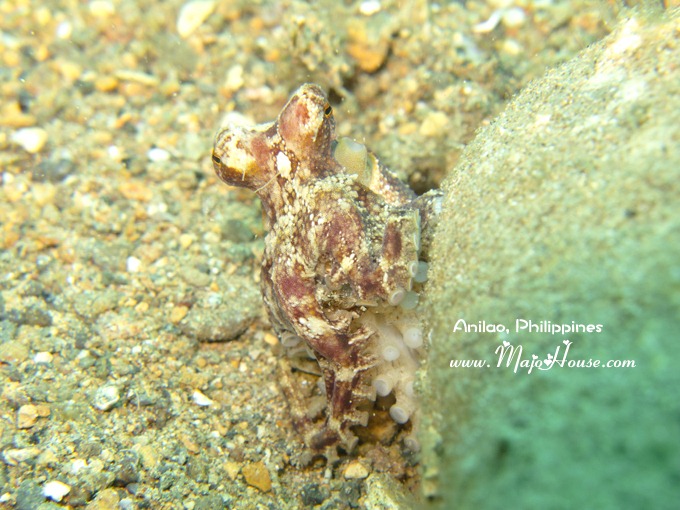 下水十几分钟之后,我正找东西,看着满地的小虾米犯愁呢,潜导用丁丁棒从石块沙地上掏出来一只小章鱼。只见它嗖嗖游开来,只想要找个地方躲起来。我真的没有多想,就觉得可能是普通的小章鱼吧,所以就跟着潜导过去拍。小章鱼老是想躲起来,潜导就努力把它挑出来;小章鱼嗖的游开躲避,我们就跟在后面群追不舍。好不容易他停在一块沙石上,我就看它长得还很可爱于是拍了起来。潜导也跟着拍拍拍,我在等他的空间,还被旁边的闪着蓝紫色光的小迷你火焰海胆给吸引过去了。是后来潜导拿出来他的小白板,在上面写下了Blue Ring, 我才惊讶,还好奇说怎么没有看到有蓝环呢?