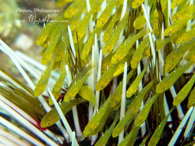 这一片地方的水流有些急促,有的时候逆流游很费力气的,我觉得我的脚都有轻微的拗到筋,每一次摆动脚蹼都有痛感。不过我还是继续游了,在浅处做停留的时候,看到一片奇怪的白色海胆上面的刺刺中间有很多很多绿色的小小鱼游在其中,也不知道是怎么个说法,不过那景色很奇妙。我在想他们是不是在躲避海流?