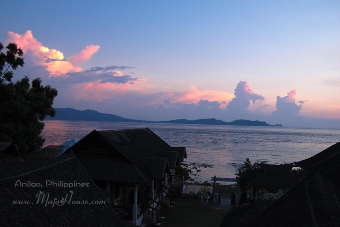 潜店餐厅上面看到的日落。我还是觉得这边的云层比较厚重,落日的颜色十分的鲜艳。半边天空都是红色的,那大海也都被染成了粉红。