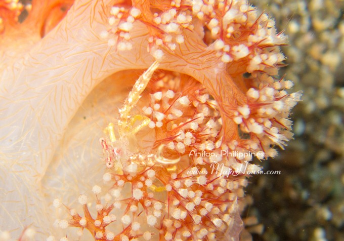 下水不久后第一个小惊奇是在软珊瑚里面躲着的嫩黄色透明小螃蟹。身体基本上和珊瑚的白色一致了,而且行动很快,一发现自己暴露了就要赶紧躲避在珊瑚丛中间。潜导用手一直掰开着珊瑚,让小螃蟹暴露在外面让我拍照。