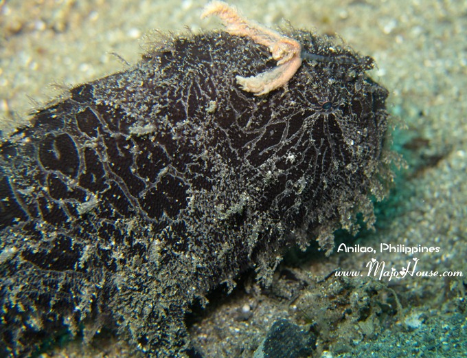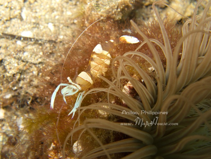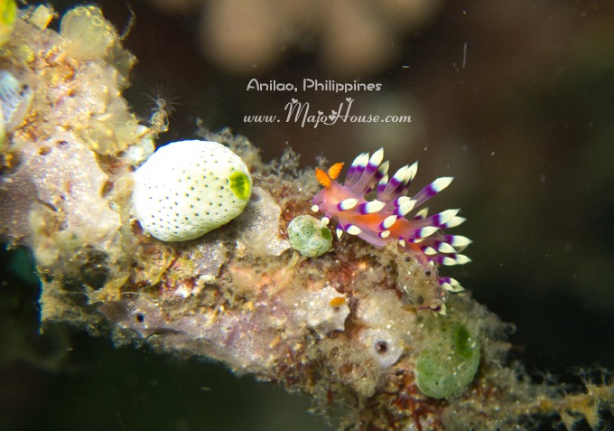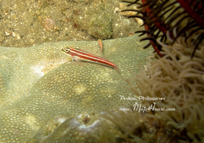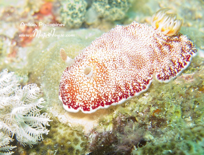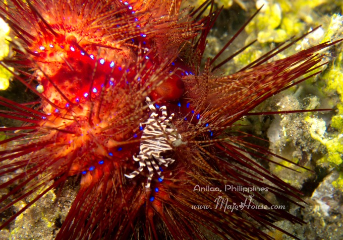 接下来的发现的是一个在火焰海胆里面生活的小红白条纹蟹。后来经海人Yorko 指明这个叫做Zebra Crab. 谁能想到这里面还有螃蟹啊,潜导指给我看的时候我简直是惊呆了。另外,Anilao的海胆还蛮多的,而且多数不是那种黑紫色的,都是殷红,篮紫色的火焰海胆,或者还有花纹的。很美,也还跑的不慢。第一天下水的时候,我还老想拍他们呢。据说这种海胆里面还住有Coleman Shrimp,不过这次我没有看到。DQ说他都是害怕海胆的,每一次看到都要躲得远远的;不过我这次都有潜导帮我看着,而且如果拍照趴下的地上有海胆,他都帮我给挑开了。真好~
