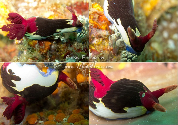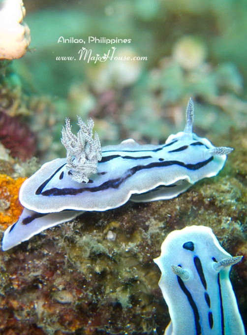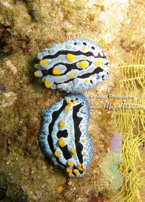 这里有一只很美丽的紫色海兔。不过,右上方,黑底黄点点的那个,是否也是一只海兔呢?