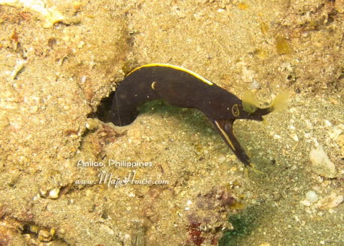 Juvenile Ribbon Eel, 那个嘴巴张得更是大哇,见到我出现恨不得张嘴把我吞掉的姿态。 我也从他黑溜溜的萌眼里,看到了满满的敌意。其实拍他的时候我根本都没有潜下去,都是在他上空远远的拉近镜头拍得呢。孩子你不要怕哇,我知道你在社会上还没有混太久,比较怕生。