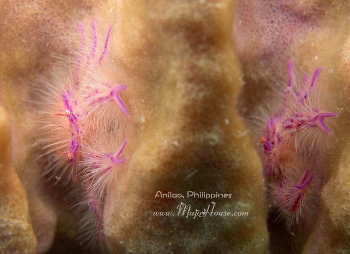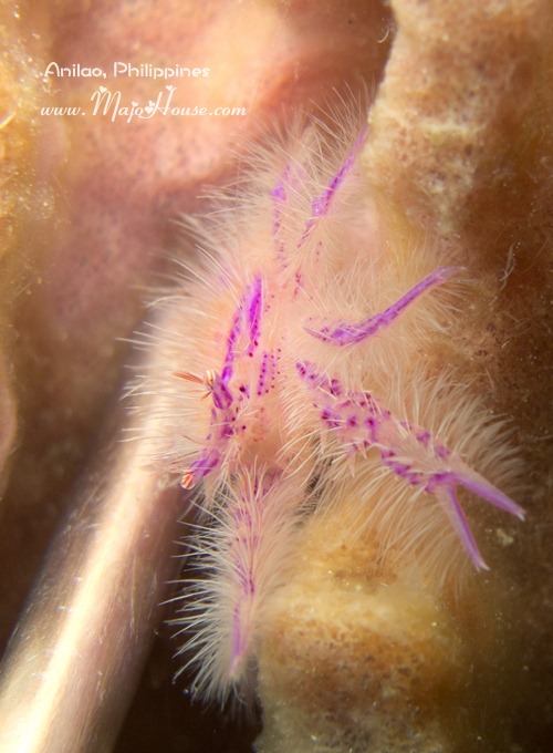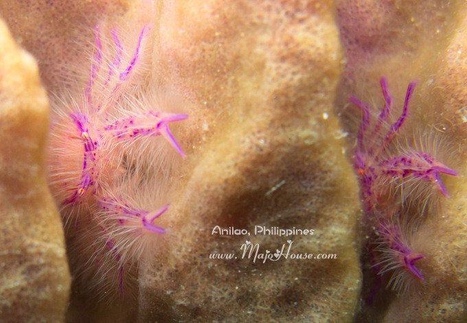 一下水,潜导Lito就领着我直奔上次那个大筒状海绵,去拍毛茸茸的小粉螃蟹(龙虾) Hairy Squat Lobster。能看得出来他一定很爱这个小蟹蟹,不然不会再次带我过来。然后,这一次我也不负众望,终于,终于拧上了微距拍得个清清楚楚。