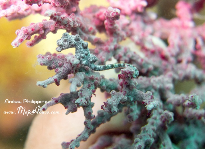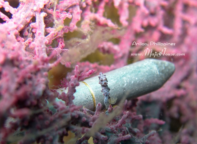 经历过了这么一个插曲,后来我趴在地上拍照的时候都要先往后张望一下四周,确定没有海蛇一类的危险生物才能安心。后来在这里又拍了小海马。最后5米停留的时候还看到一只嫩绿色大的海马,可是他被冲得一直停不下来。潜导拿手去拦都不管用。到最后也只好就放弃了。