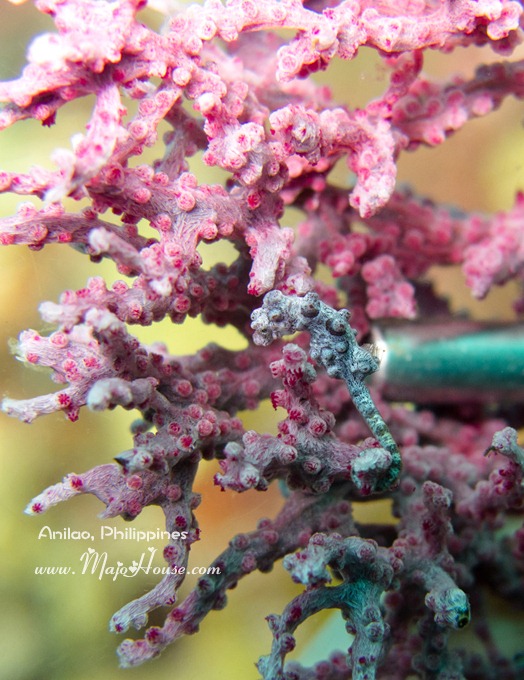 游到那个岩壁急流处的紫色海扇那里,开始寻找豆丁的踪迹。翻来翻去看了好长时间,眼前还是只有密麻麻的海扇而已,一点儿有“动静”的东西都没有。就这么搜索了将近五分钟,终于,我第一个发现到一只;没过多久,Lito也发现了另外的是两只一起的。嘿嘿,大收获。