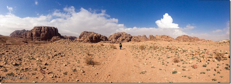 我们在山下这片平地,毫无遮掩的地方,太阳反而出来并且大晒起来。我们走的不是大道,而是旁边小土坡上面的小路。走小路的好处就是,没有人!完全没有人!!于是,下面这张出自iPhone的Panorama里,我成了天地间唯一的人。嘻嘻~