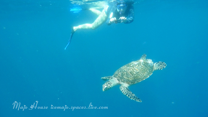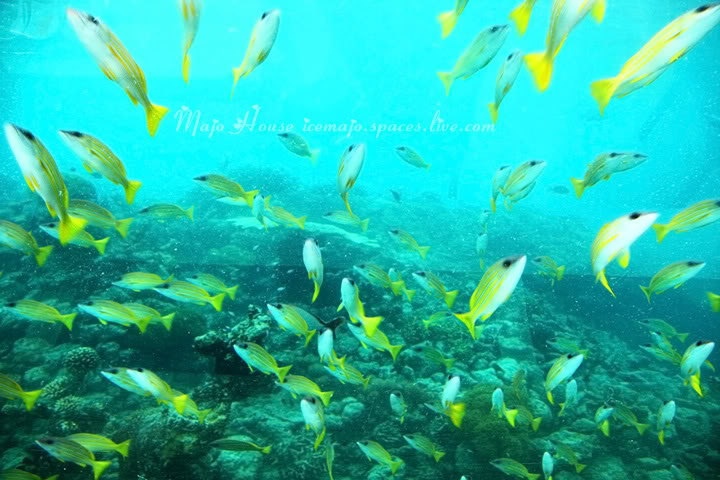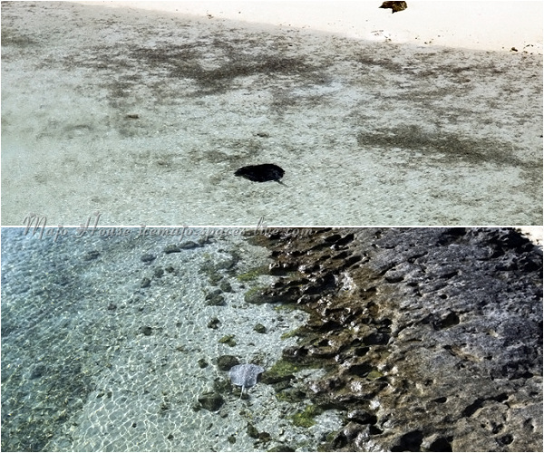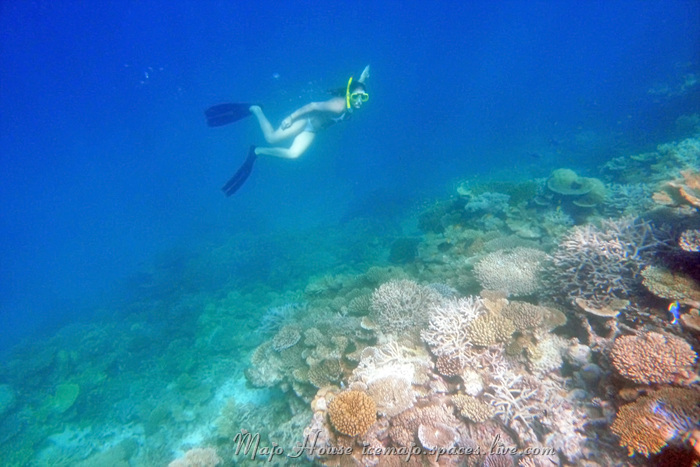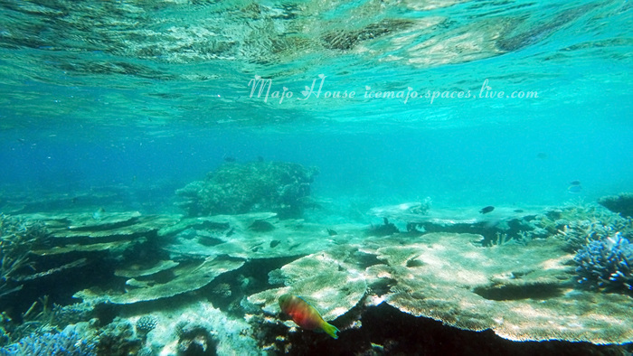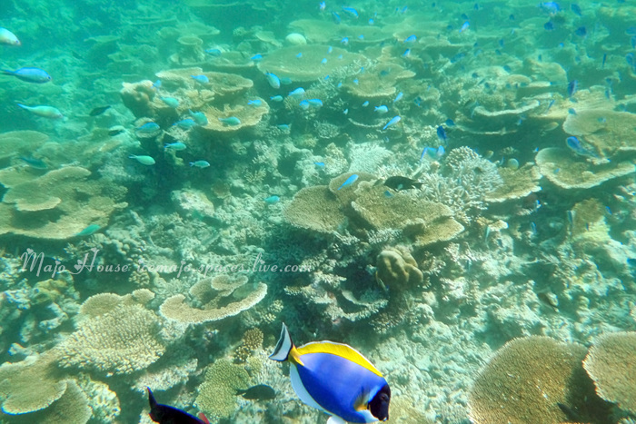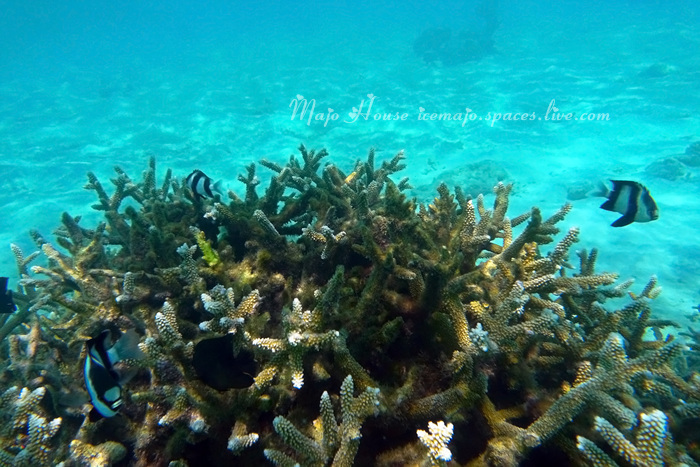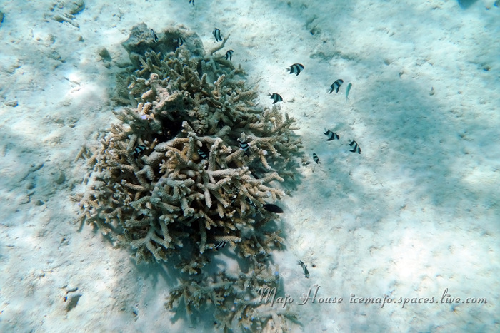 大概从大岛的沙滩屋#235的沙滩处下海,一路这么游出去就会碰到那一大片的珊瑚。当然我们还不敢独自出海的,所以这还是有参加活动 Discover Snorkeling. (很便宜的,一个人只要$20. ) 首先潜水老师带我们从浅滩处慢慢游过去,最开始水大概只有到腰部,珊瑚很少,水很透底,不过鱼都很多了。