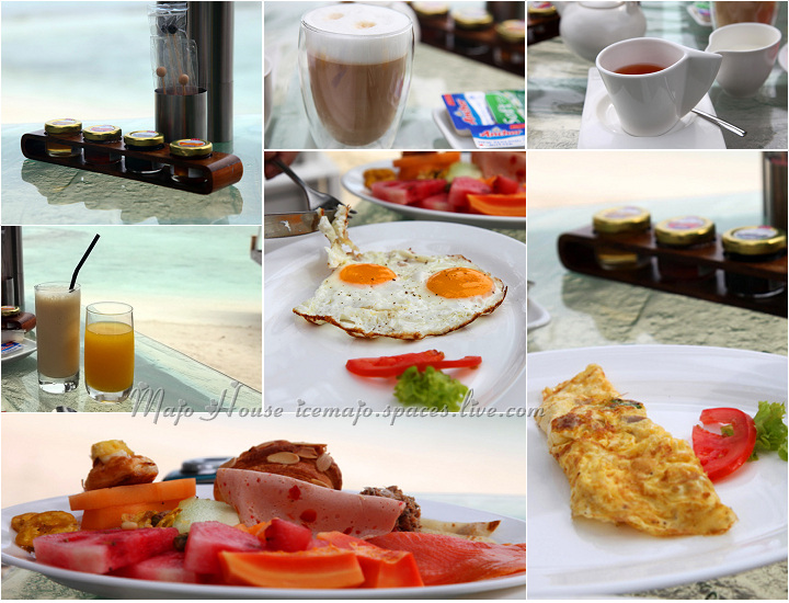 虽然晚餐在那边是要额外付钱的,但是早餐却是免费包括在房钱内的。依旧还是无敌的辽阔海,白天看起来比晚上更加得有气势。非常透明浅绿色的玻璃桌子,和早晨的浅滩颜色一模一样。