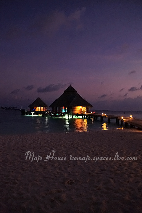 到了晚上呢,暗黄的灯光下却显得很是神秘,很有酒吧的感觉啦。室内的大沙发坐起来非常非常的舒服,而且里面也都是沙子地所以感觉上也都很是放松的。Rangali Bar每天旁晚也有Happy Hour, 4-6点在这边点当天的special drink有折扣。