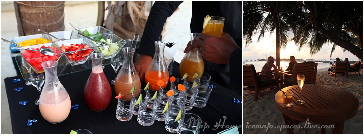 不过呢,某天下午,过去那边躺在沙滩什么都不干的时候。一位好心的Waiter过来问要不要喝点什么,他们白天提供各种的汽水饮料Smoothie. 于是我就要了个Smoothie. 很贴心的是,Smoothie不是固定的,是你自己可以随便搭配的。小哥花了5 分钟的时间给我介绍都有哪些水果,最后给我端过来一杯草莓加芒果。他还说自己第一次做呢,希望我都可以喜欢。看他那么的真诚贴心,我一心欢赏了他2米大洋。后来我发现,这杯smoothie价值$10.50米的时候,我又哭了。