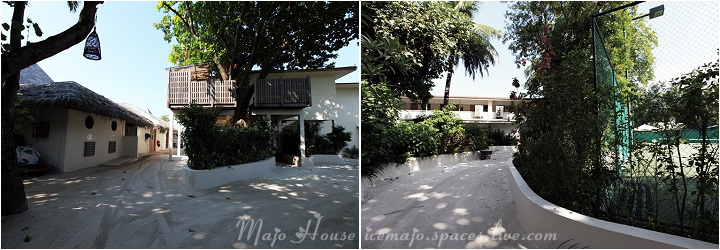 Atoll Market也都是敞开的建筑。桌席有在室内的也有在室外沙滩上的,但是基本区别不大,因为室内的也都是沙滩地,就是晒不到太阳而已。上午的时候,从大岛看小岛最美丽,所以在这边吃早饭,看沙滩上面的鸡蛋花林中露出来的点点蓝色白色,非常的舒服。