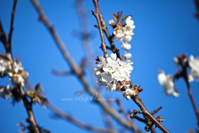 今年的樱桃树。从花朵的数量来判断,应该是会大丰收的。看那满枝头的花梗,将来都会变成小樱桃的。树顶端得就留给流浪的小鸟们吧,下面的那些要记得及时摘。话说这颗还是那种红黄色的樱桃的,比深红色的那种来的香甜。